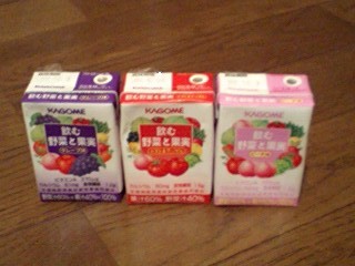 昨夜母刀自に頂いた野菜ジュースの試供品。金と青はさすがになかった。食べ物の色的な意味で。